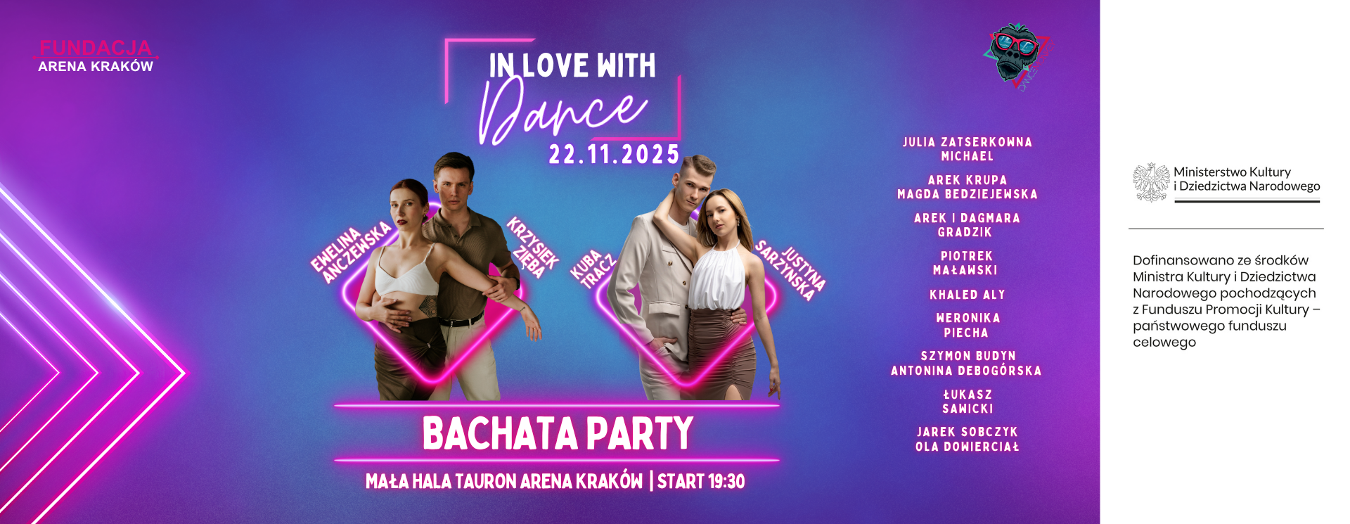 Przed Wami kolejna, druga edycja „In Love with Dance”, a wraz z nią wyjątkowe Bachata Party w Małej Hali TAURON Areny Kraków! Na wszystkich fanów latynoskich rytmów czekają warsztaty przed imprezą, goście specjalni i wyjątkowa lokalizacja – 22 listopada 2025 r. nie może zabraknąć Cię z nami!