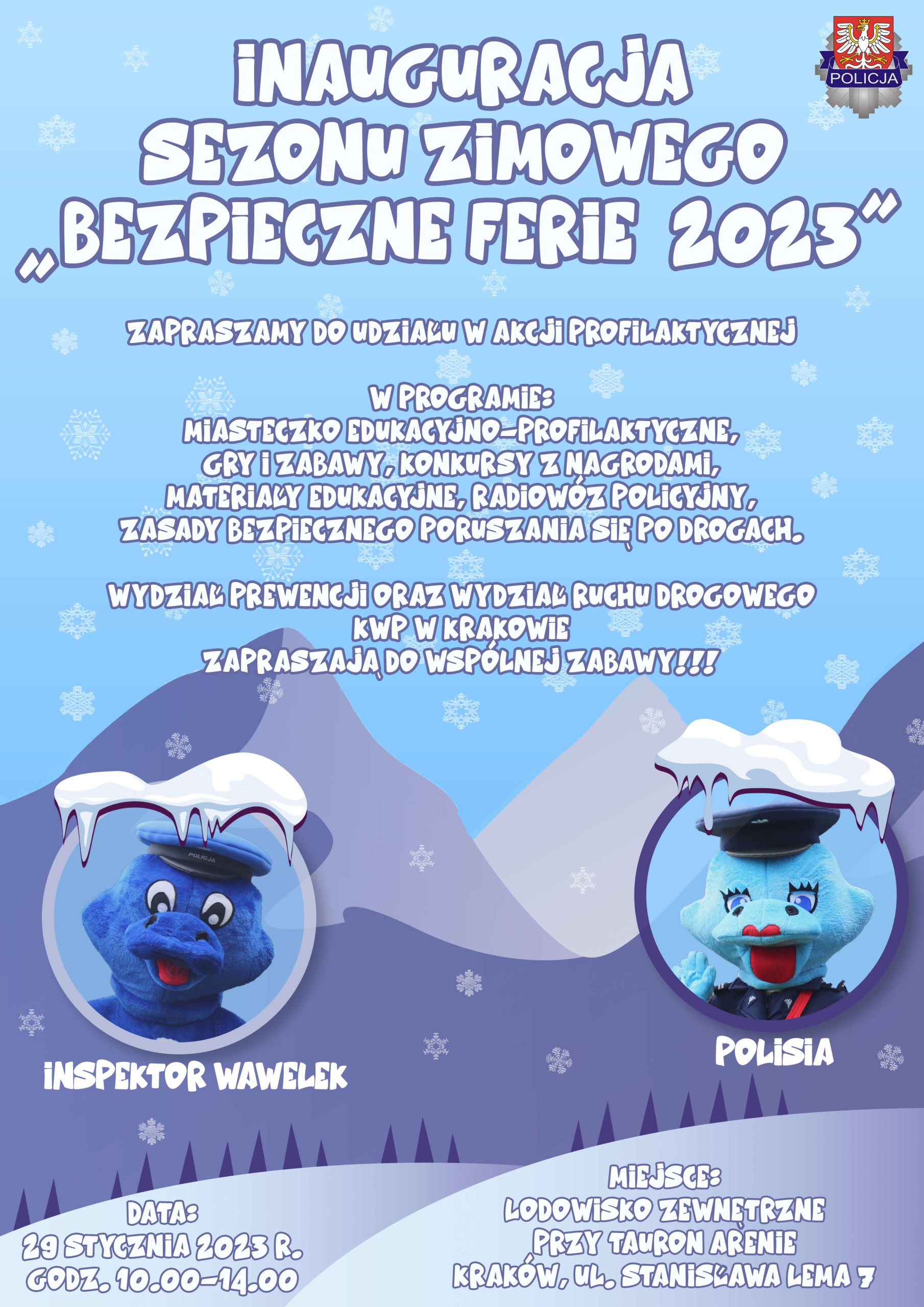 W ramach wydarzenia, które odbędzie się przy TAURON Arenie Kraków policjanci będą przypominać o podstawowych zasadach dotyczących: bezpieczeństwa na stoku, lodowisku i zamarzniętych zbiornikach wodnych, podczas spędzania czasu wolnego w domu lub na zorganizowanym wypoczynku zimowym, w podróży, bezpieczeństwa poruszania się po drogach i szlakach górskich, a także podczas gier i zabaw rekreacyjnych w terenie.