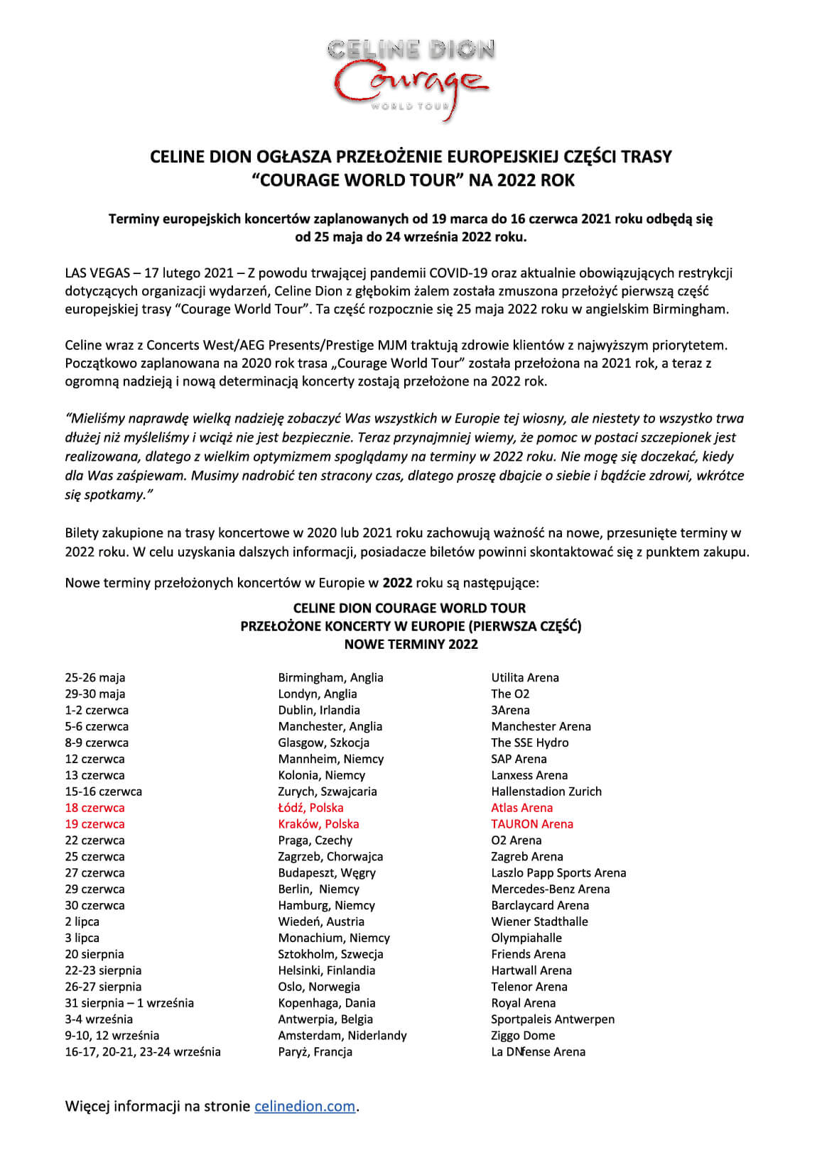 Céline Dion ogłosiła nowe daty koncertów w ramach trasy COURAGE WORLD TOUR w Europie. Z powodu pandemii COVID-19 artystka przełożyła wszystkie występy na przyszły rok. Wśród zaplanowanych koncertów Kanadyjki, dwa odbędą się w Polsce: 18 czerwca 2022 roku w Atlas Arena w Łodzi i 19 czerwca 2022 roku w TAURON Arenie Kraków.