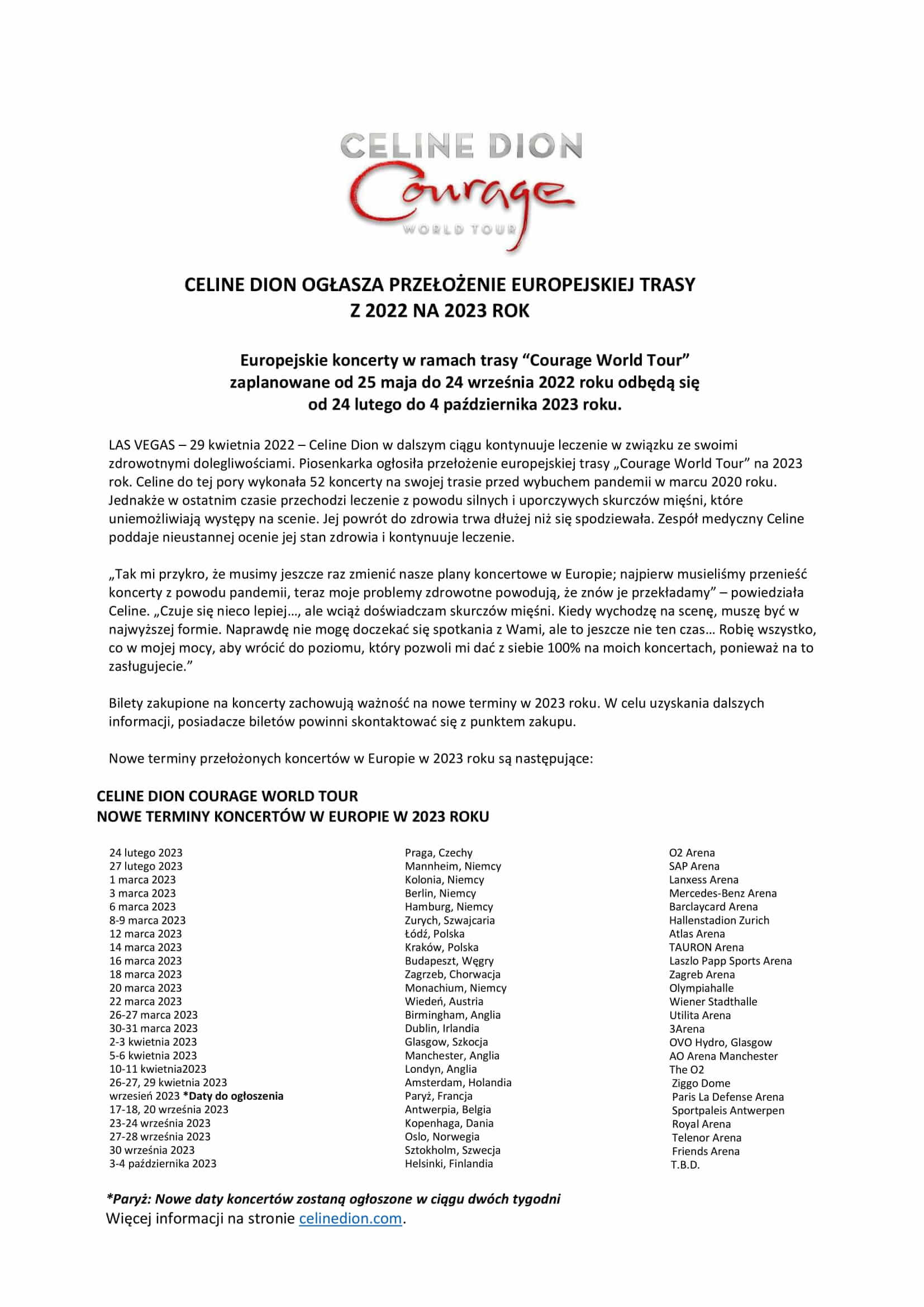 „Wyczekiwane w tym roku europejskie koncerty Céline Dion artystka przekłada na następny rok. Ma to związek z jej stanem zdrowia, o czym mówi w specjalnie przygotowanym nagraniu. Zapewnia też, że zrobi wszystko, by spotkać się ze swoją publicznością. Potrzebuje jednak jeszcze trochę czasu, by w pełni dojść do sił.