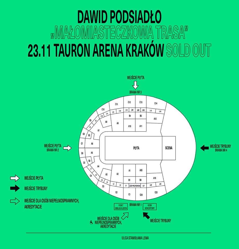 Koncert Dawida Podsiadło odbędzie się w TAURON Arenie Kraków 23 listopada 2018 r. o godz. 20:30. Bramy zostaną otwarte o godz. 18:30 (podana godzina jest orientacyjna i może ulec zmianie).