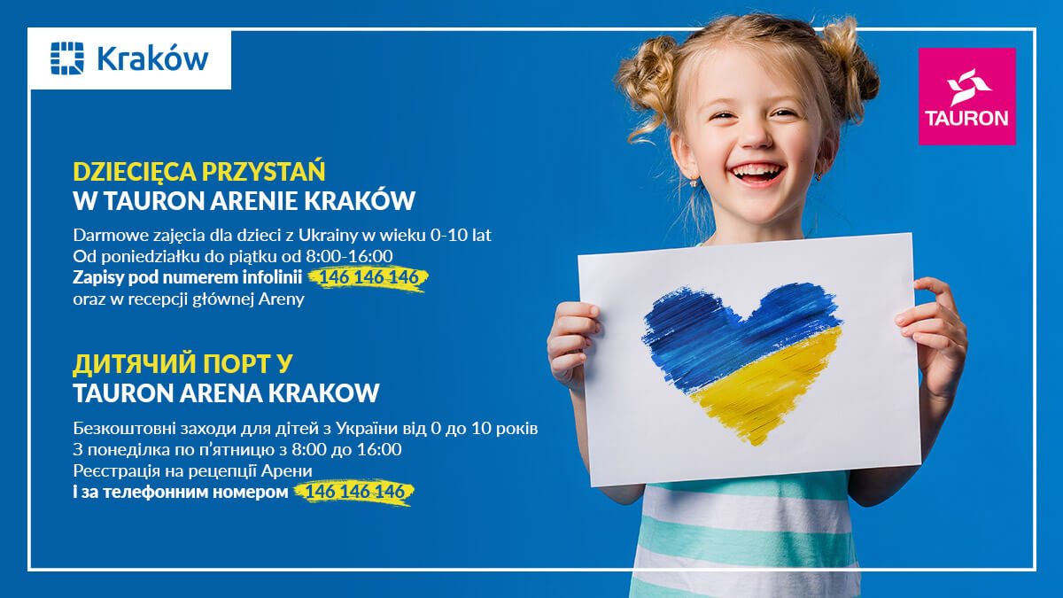 Спортивні заходи, анімації для дітей, місце для відпочинку – все це чекатиме дітей та їхніх опікунів з України у «Дитячій Пoрт», яка з вівторка працюватиме в TAURON Arena Krakow. Заявки приймаються за телефоном 146 146 146, а також через Інтернет-заявку або особисто в TAURON Arena Kraków.