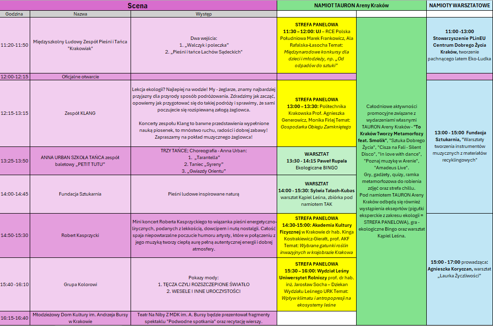 W trakcie wydarzenia działać będzie scena plenerowa a na niej m.in. występy zespołów wokalnych i tanecznych, działających pod egidą krakowskich domów kultury, pokaz mody z recyclingu grupy „Kolorowi”, występ grupy Sztukarnia (polskie pieśni ludowe) oraz mini recital krakowskiego barda i poety Roberta Kasprzyckiego.