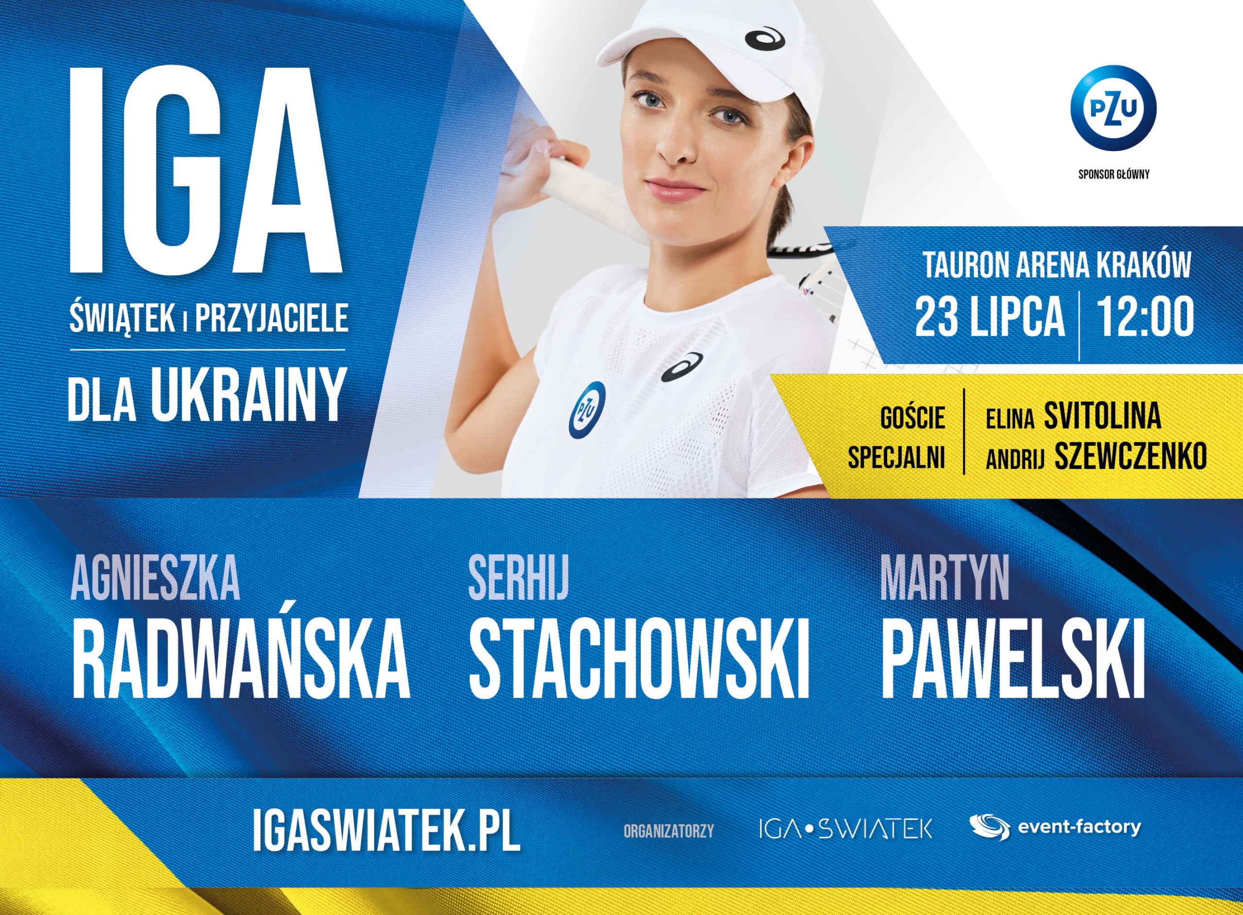 „Iga Świątek i Przyjaciele dla Ukrainy” to unikatowe w skali całego świata charytatywne wydarzenie sportowe – w tym samym czasie na korcie będzie można zobaczyć najlepszych tenisistów z Polski i Ukrainy. Zmierzą się, by poprzez siłę sportu zbierać środki na pomoc Ukrainkom i Ukraińcom w czasie wciąż trwającej wojny. Najlepsza tenisistka świata, Iga Świątek, rozegra jeden set singla z Agnieszką Radwańską. W pokazowym meczu miksta zmierzą się dwa duety: ukraiński tenisista Serhij Stachowski i Agnieszka Radwańska oraz Iga Świątek i doskonale rokujący polski junior Martyn Pawelski.