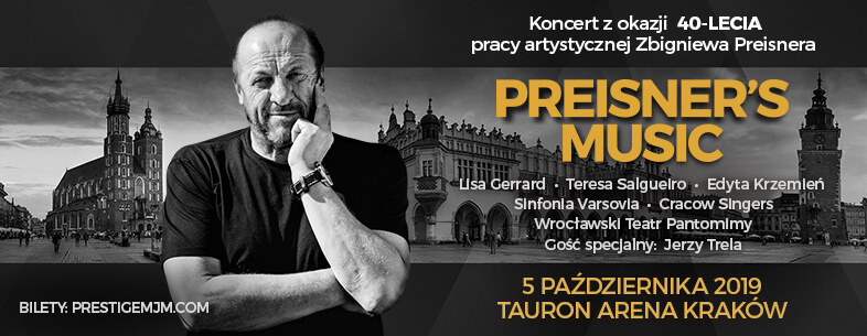 Zbigniew Preisner – jeden z najwybitniejszych współczesnych kompozytorów filmowych na świecie, twórca epokowych dzieł do produkcji Krzysztofa Kieślowskiego! czy Agnieszki Holland – specjalnym koncertem będzie świętował swój jubileusz 40-lecia pracy artystycznej. Zaproszenie do udziału w tym niezwykłym wydarzeniu przyjęli wspaniali muzycy z kraju i zagranicy, m.in. Lisa Gerrard, Teresa Salgueiro, Edyta Krzemień, Sinfonia Varsovia i Cracow Singers. Na scenie pojawią się także aktorzy Wrocławskiego Teatru Pantomimy, a gościem specjalnym będzie Jerzy Trela. Koncert odbędzie się 5 października 2019 roku w TAURON Arenie Kraków. Bilety do sprzedaży trafią w środę, 16 stycznia.