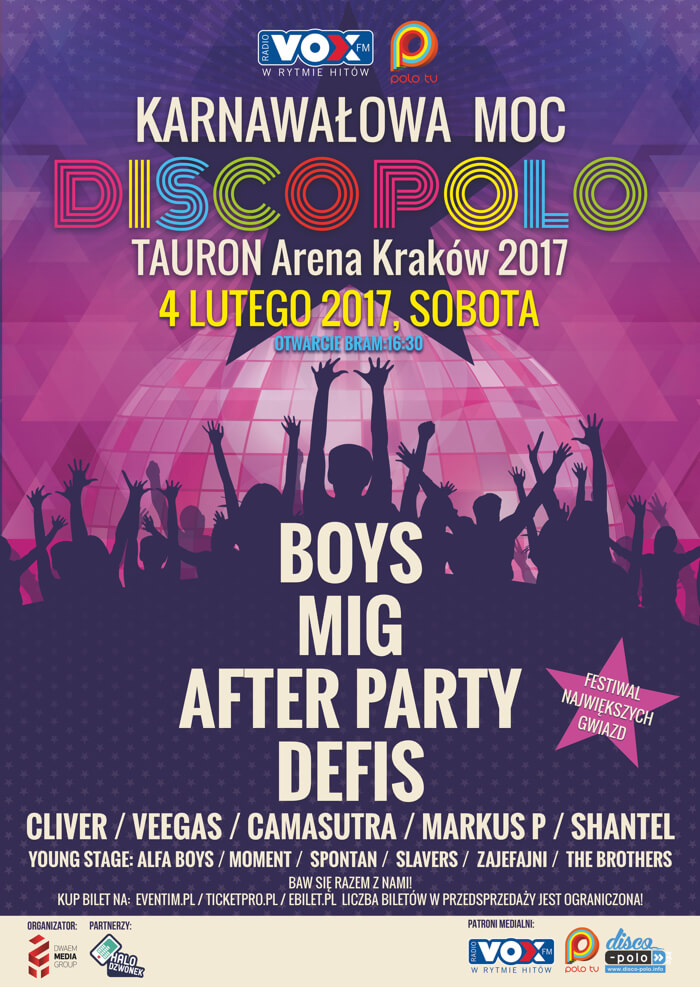 Przedsprzedaż biletów na „Karnawałową Moc Disco Polo“ w TAURON Arenie Kraków startuje 12.10.2016 o godzinie 12.00 w bileteriach: