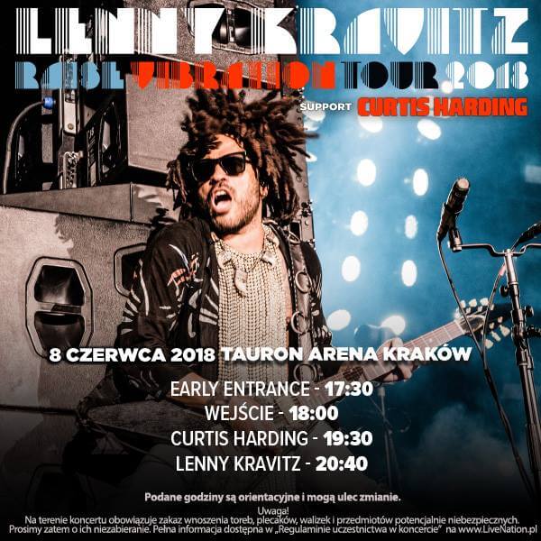 Lenny Kravitz wystąpi w TAURON Arenie Kraków 8 czerwca 2018 r.: godz. 17:30* – Early Entrance, godz. 18:00 – otwarcie bram, godz. 19:30 – Curtis Harding, godz. 20:40 – Lenny Kravitz,