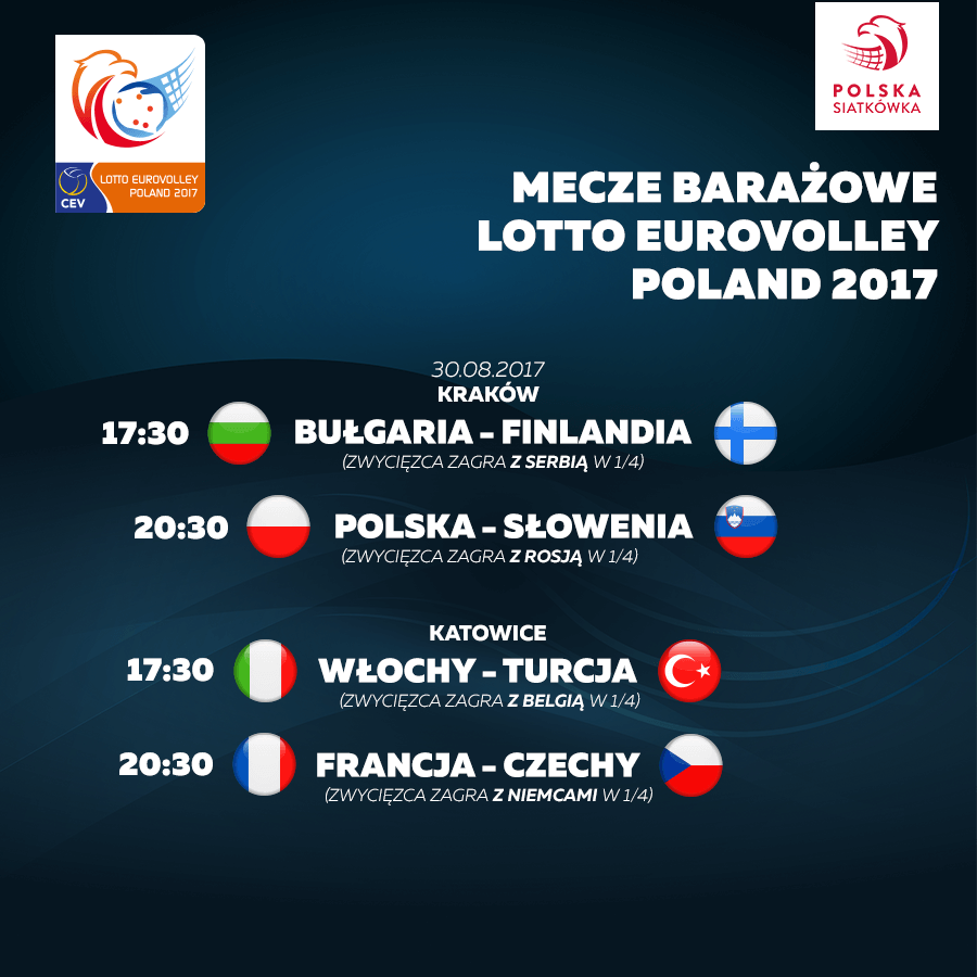 CEV Mistrzostw Europy w Piłce Siatkowej Mężczyzn – LOTTO EUROVOLLEY POLAND 2017 weszły w kolejną fazę. Dziś (30 sierpnia) w #TAURONArenaKraków cztery drużyny powalczą o awans do ćwierćfinałów. W pierwszym meczu Bułgaria zmierzy się z Finlandią, w drugim Polska ze Słowenią.
