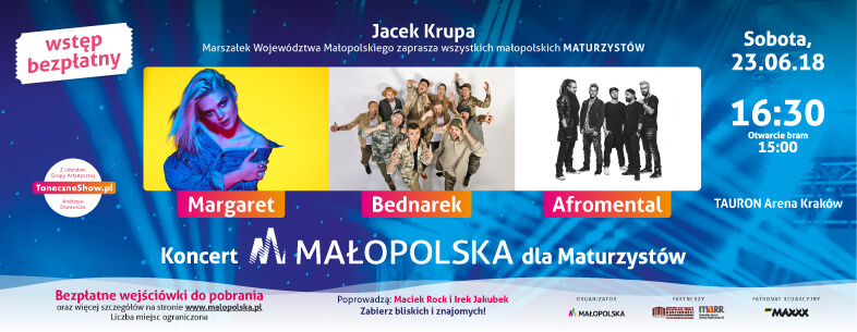 To będzie wyjątkowe wydarzenie. Pierwsze takie w historii, a do tego bezpłatne. W jednym miejscu spotkają się wszyscy tegoroczni małopolscy maturzyści. Po miesiącach ciężkiej nauki, nieprzespanych nocach, a w końcu wielkim teście wiedzy – egzaminie dojrzałości – czas na odpoczynek i dobrą zabawę. Już 23 czerwca (sobota) w TAURON Arenie Kraków specjalnie dla nich zagrają topowe, polskie gwiazdy: Margaret, Kamil Bednarek i Afromental. Małopolska już dziś zaprasza maturzystów na ten niepowtarzalny koncert.