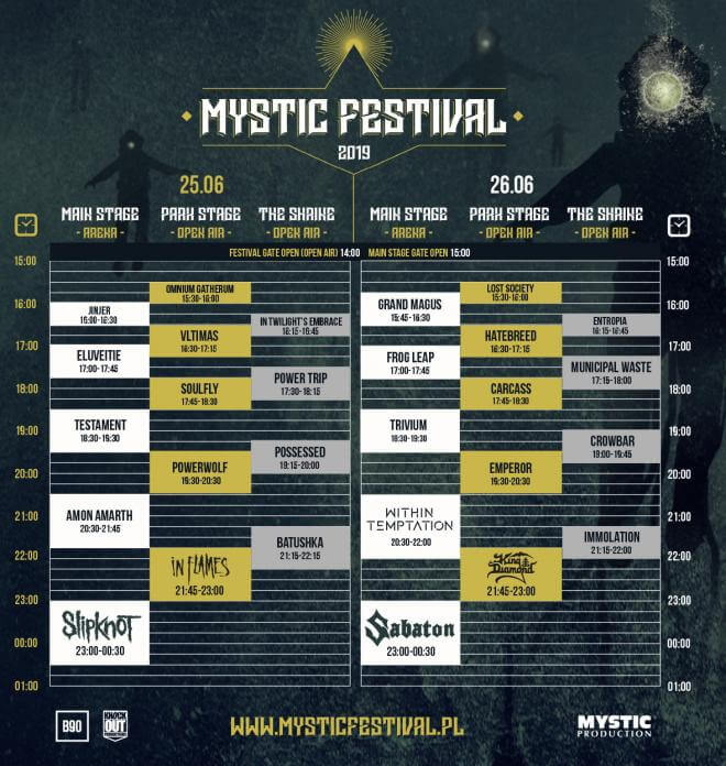 MYSTIC FESTIVAL 2019 zaprezentował czasówkę tegorocznej edycji, która odbędzie się w TAURON Arenie Kraków. Podczas dwóch dni festiwalu (25-26 czerwca) na trzech scenach – Main Stage, Open Stage (scena open air) i The Shrine (scena open air) – wystąpi 28 zespołów. Do 11 kwietnia fani mają ostatnią szansę, aby zakupić tańsze karnety oraz bilety jednodniowe.