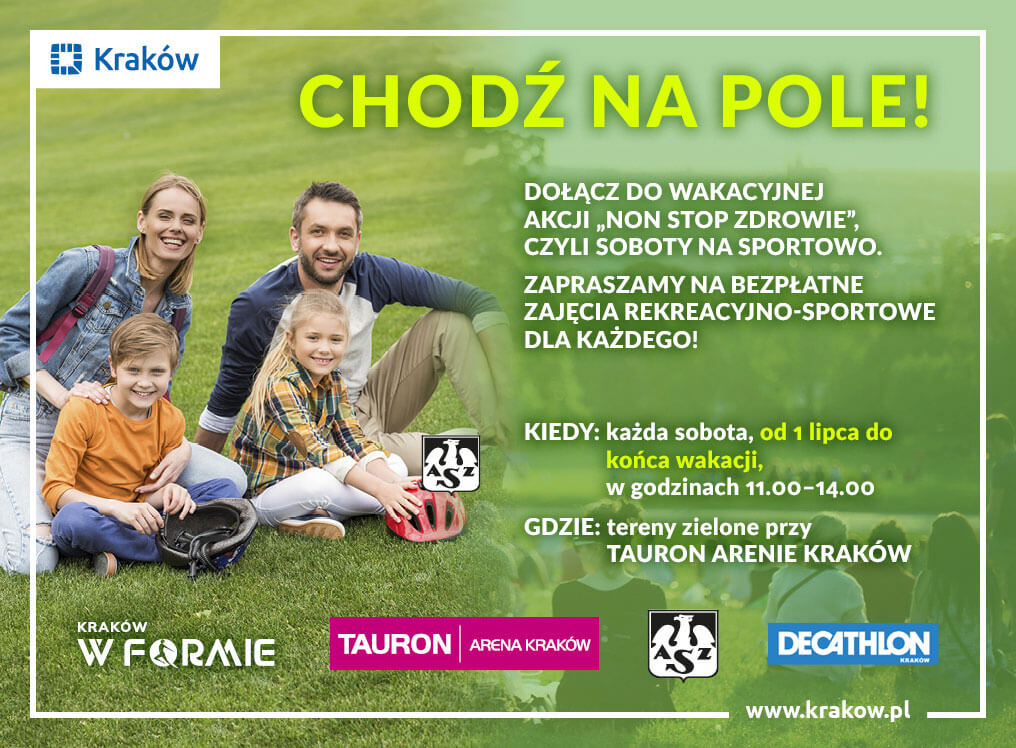 Zapraszamy dzieci i młodzież na cykl bezpłatnych zajęć sportowych pod hasłem: Non-Stop Zdrowie. Zajęcia odbywają się w każdą sobotę, od 1 lipca do końca wakacji, w godz. 11:00-14:00, na terenach zielonych przy TAURON Arenie Kraków. Będziemy ćwiczyć wspólnie z trenerami z AZS AWF Kraków, Decathlon Kraków, Ewą Grzelczak – trenerką Caligraphy Health System, trenerami Klubu Forma na Lata oraz ze Smykami z gimnastyki. Projekt wpisuje się w miejską kampanię promującą aktywne spędzanie wolnego czasu „Kraków w Formie”.