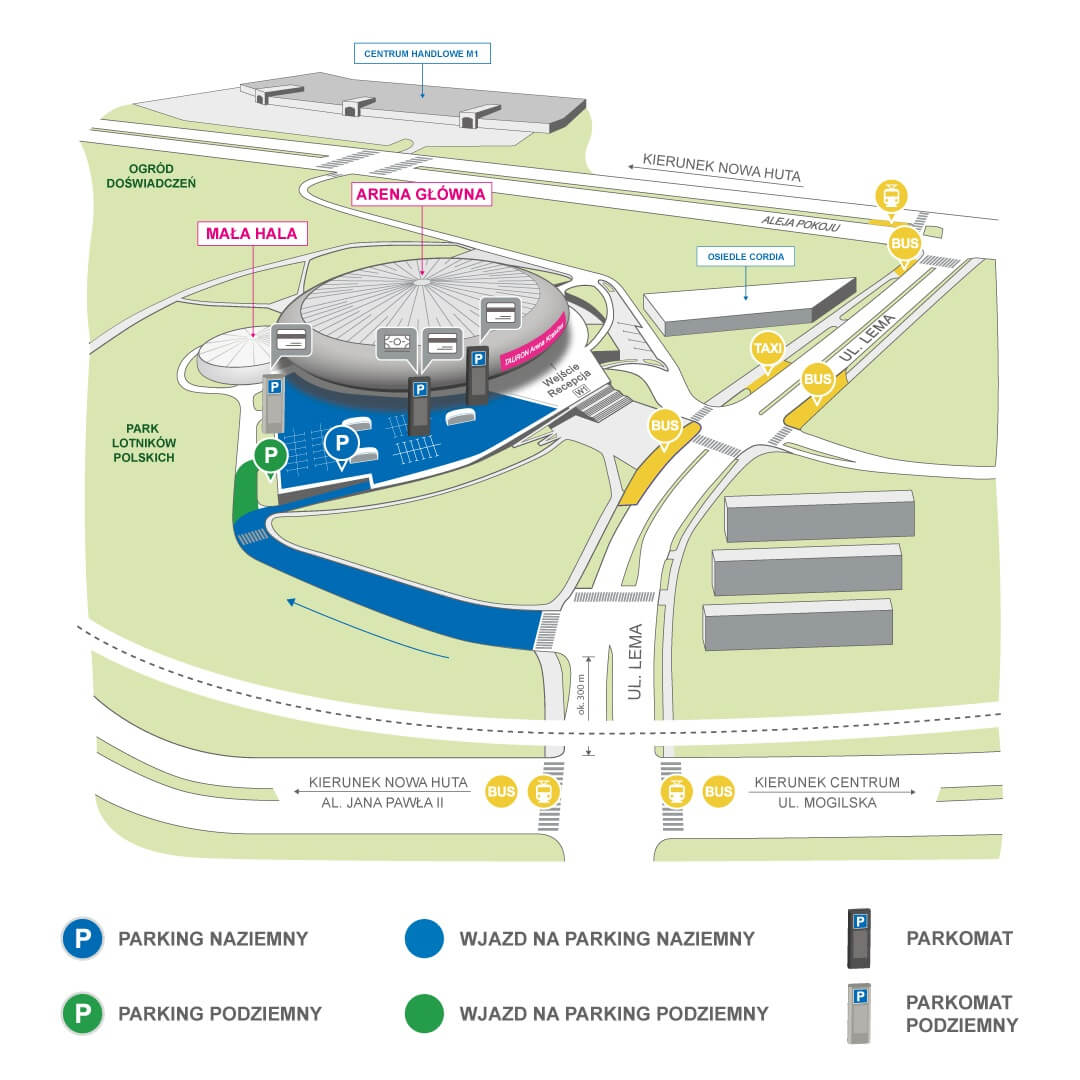W sąsiedztwie TAURON Areny Kraków znajdują się przystanki tramwajowe i autobusowe: