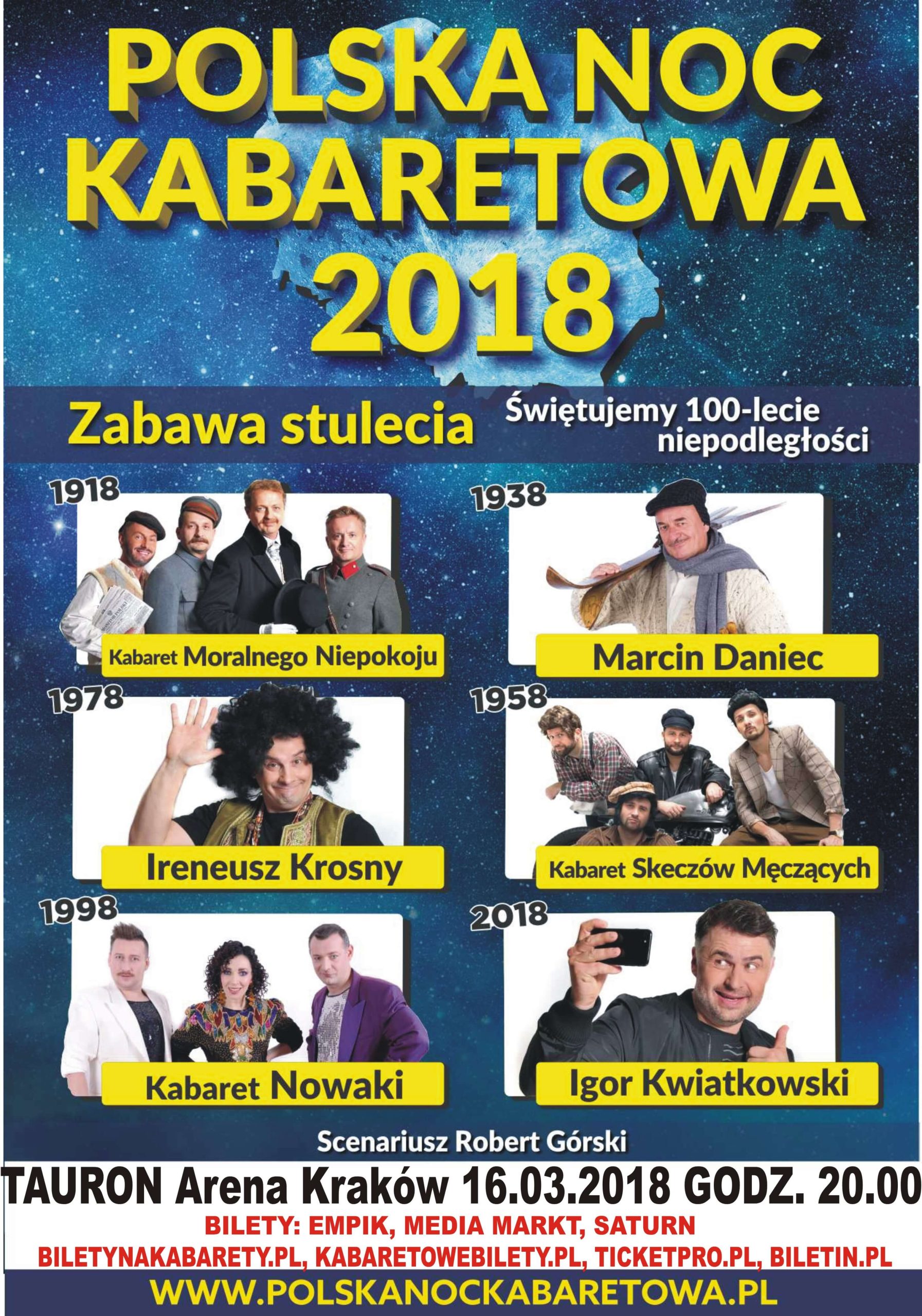 Zabawa stulecia Świętujemy 100-lecie Niepodległości 16 marca (piątek) godz. 18:30 – otwarcie bram godz. 20:00 – rozpoczęcie wydarzenia godz. 23:40 – planowane zakończenie imprezy Kabaret Moralnego Niepokoju, Ireneusz Krosny, Marcin Daniec, Kabaret No...
