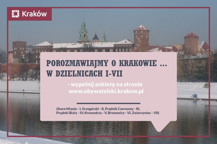 Urząd Miasta Krakowa przystępuje  do realizacji badania ankietowego pn. „Porozmawiajmy o Krakowie w dzielnicach I-VII”. Badanie jest kontynuacją akcji przeprowadzonej już w dzielnicach Nowej Huty i Podgórza. Celem badania jest zebranie opinii mieszkańców i mieszkanek dotyczących działań Miasta na rzecz poprawy jakości życia w ich najbliższym otoczeniu.