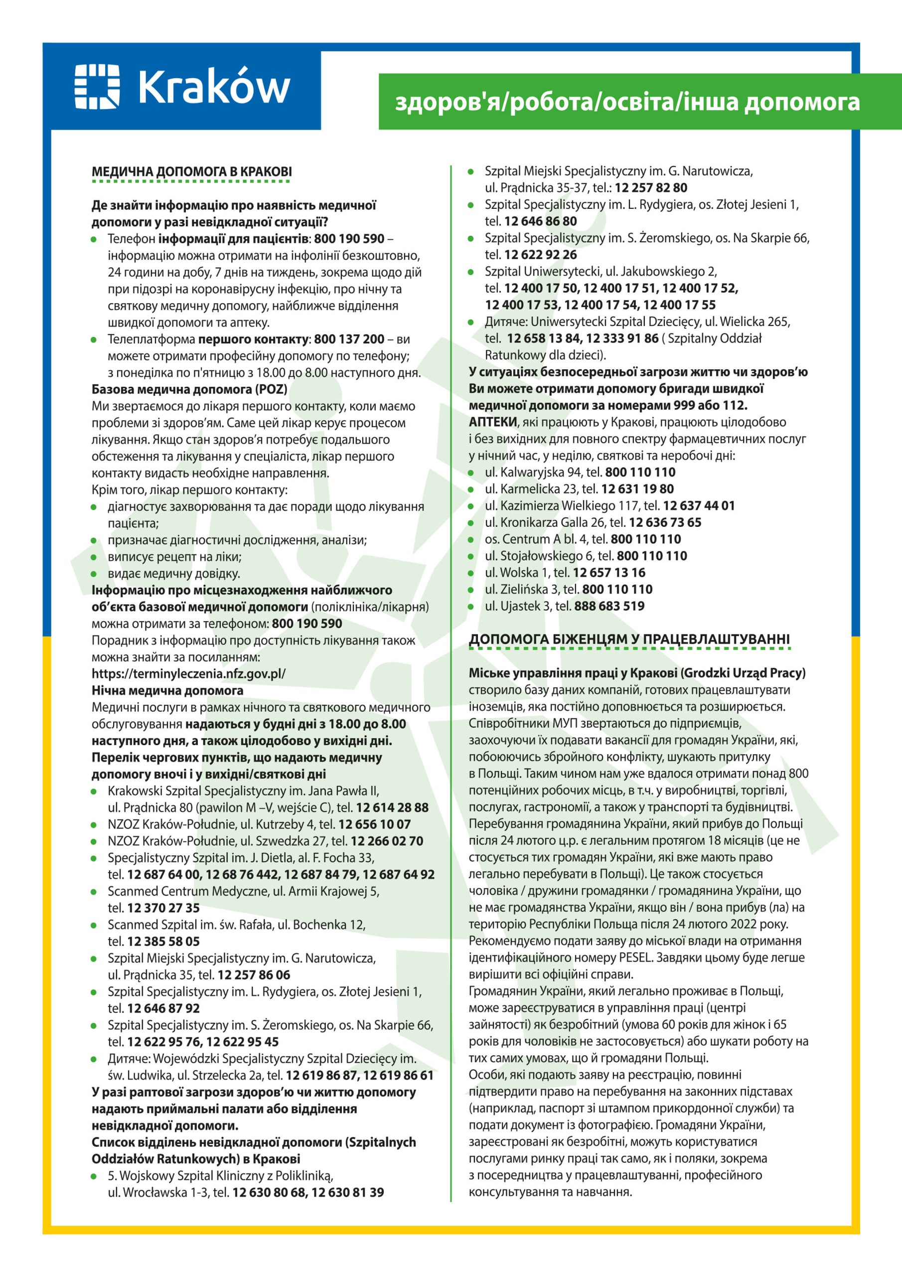 Stanowisko Grodzkiego Urzędu Pracy czynne od poniedziałku do soboty w godz. 8:00-20:00. Udzielane są tutaj m.in. informacje o pracodawcach oferujących pracę obywatelom Ukrainy oraz Agencjach Pośrednictwa Pracy w Krakowie. Do podjęcia pracy nie ma konieczności posiadania numeru PESEL.