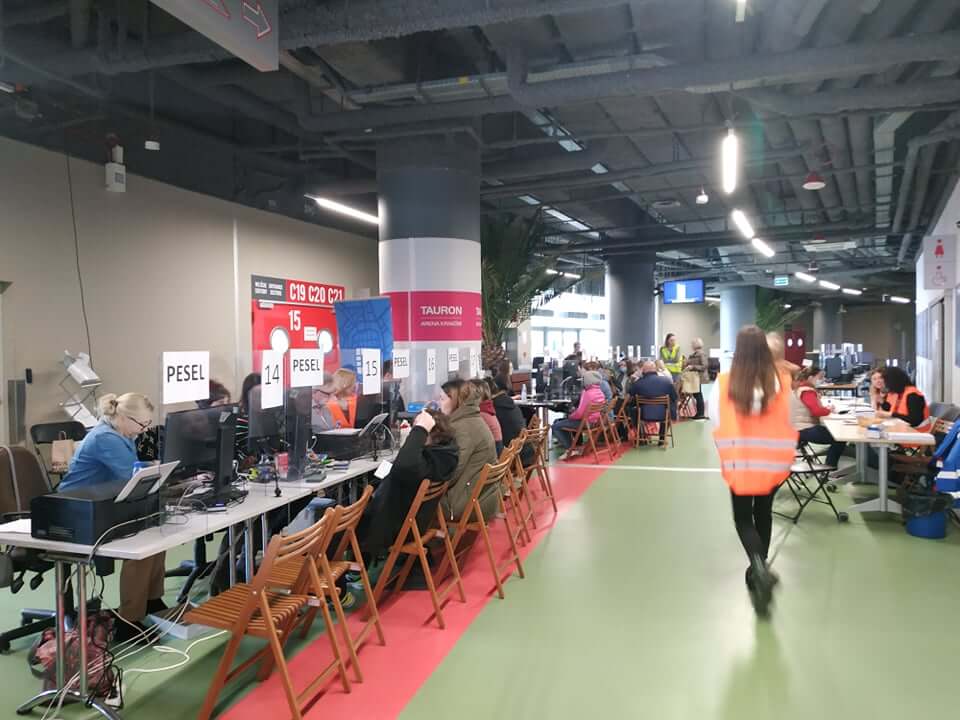 Ponad 100 osób obsługi – urzędników, wolontariuszy, przedstawicieli służb, pracowników areny, ponad 60 stanowisk – do wydawania numer PESEL, wypełniania wniosków o świadczenia socjalne i pomocy w znalezieniu pracy, kilkaset osób obsługiwanych przy stanowiskach – tak każdego dnia wygląda punkt rejestracji uchodźców z Ukrainy w TAURON Arenie Kraków.
