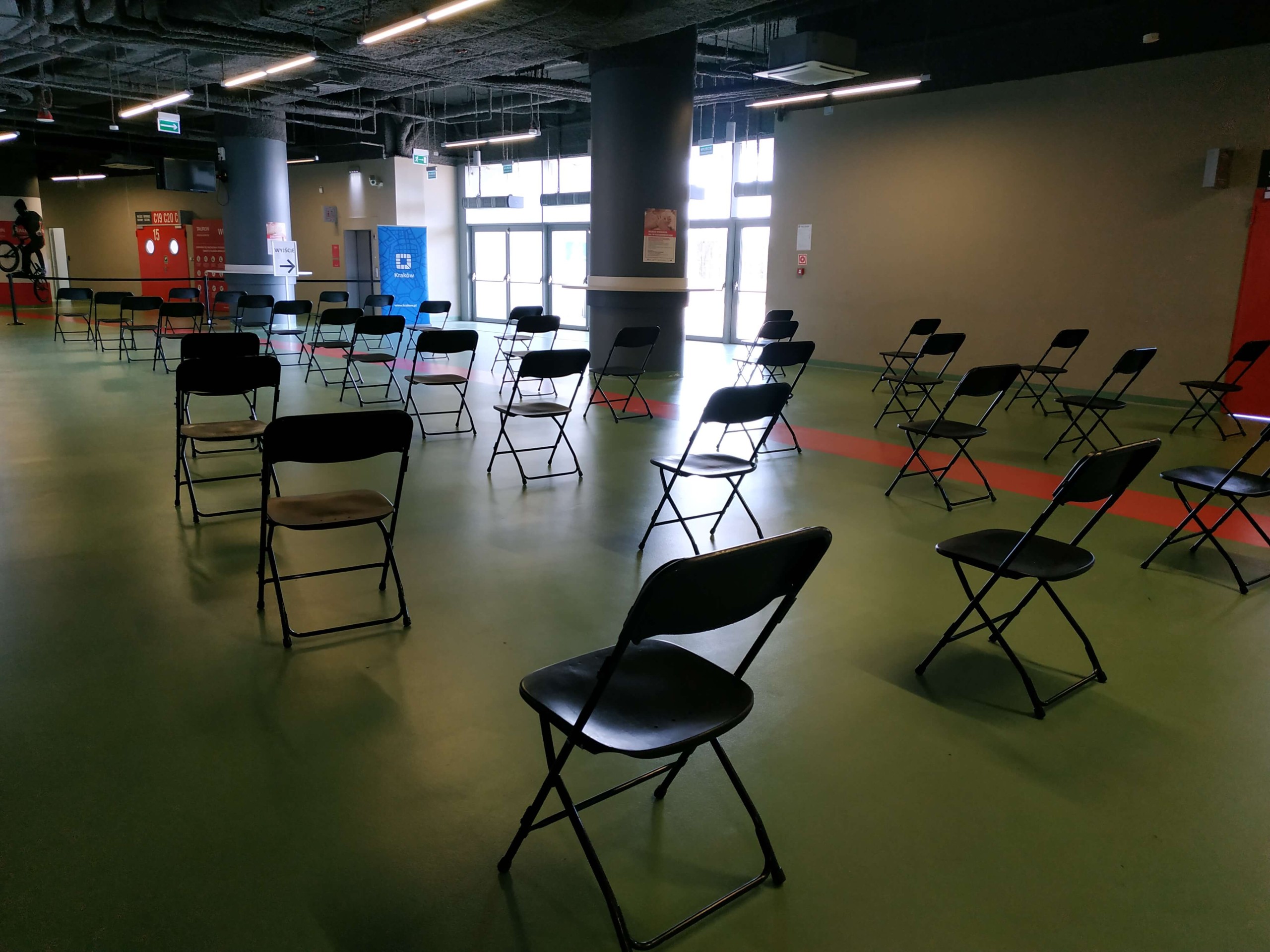 Stanowiska do szczepień są zlokalizowane we foyer obiektu.