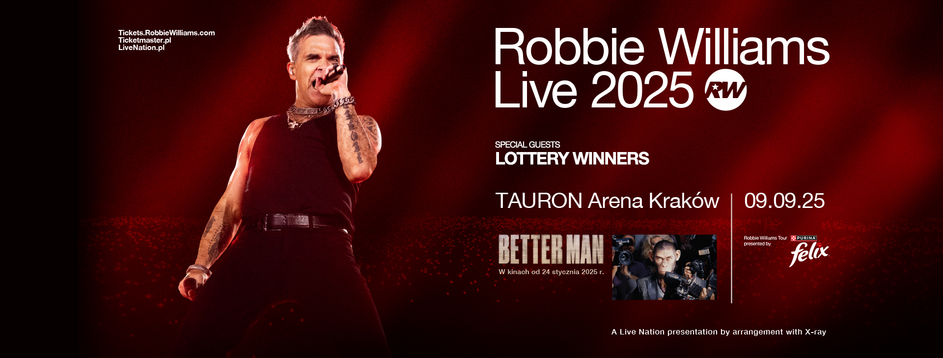Ogłoszenie trasy następuje w momencie, gdy fani z niecierpliwością oczekują premiery filmu biograficznego „Better Man”, który trafi do kin w Wielkiej Brytanii 26 grudnia i w którym Robbie jest przedstawiony jako CGI małpa… Historia, oparta na prawdziwym życiu Robbiego i wyreżyserowana przez Michaela Graceya („Król rozrywki”), jest wyjątkowo opowiedziana z perspektywy samego Robbiego, ukazując jego charakterystyczny dowcip i niezłomnego ducha. Film śledzi jego drogę od dzieciństwa, przez udział w zespole Take That, aż do niesamowitych sukcesów jako solowego artysty, mierzącego się jednocześnie z wyzwaniami, jakie niesie za sobą ogromna sława. Reżyser Michael Gracey, odnosząc się do powtarzającego się opisu siebie jako „małpy”, mówi: “Robbie would say things like, ‘I’m up the back dancing like a monkey.’ After a while, I thought, ‘Wouldn’t it be amazing to represent Robbie as a monkey in the film?’ Because Robbie is telling this story – and that’s how he sees himself.”