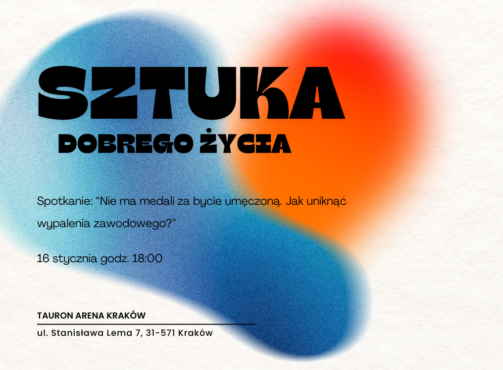 STRONA GŁÓWNA Tauron Arena Kraków / Aktualności / Bez kategorii / Ruszamy z cyklem „Sztuka Dobrego Życia” – pierwsze spotkanie w styczniu 9 grudnia 2024 Ruszamy z cyklem „Sztuka Dobrego Życia” – pierwsze spotkanie w styczniu W codziennym biegu często zapominamy o tym, co naprawdę ważne – o naszym zdrowiu psychicznym, emocjonalnym i fizycznym.