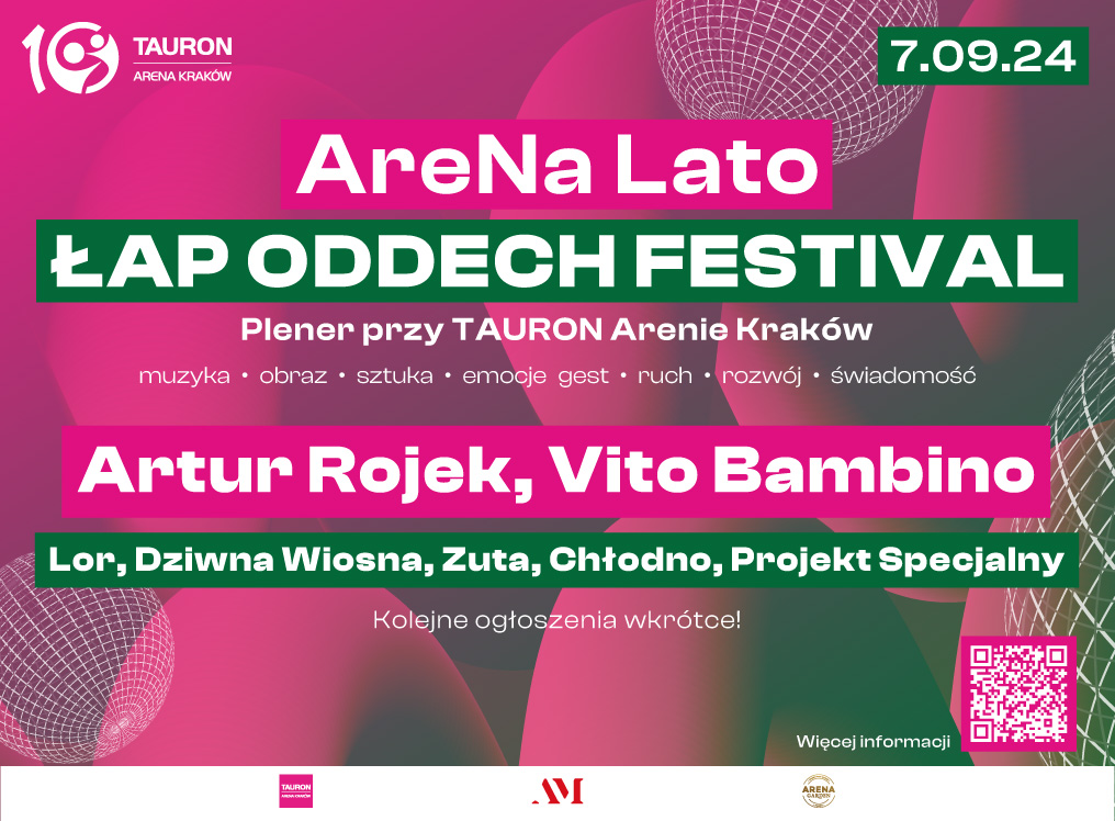 AreNa Lato – Łap Oddech Festival to wydarzenie jakiego w Krakowie jeszcze nie było! Projekt zakłada prezentację szeroko pojętej sztuki w ujęciu interdyscyplinarnym, a że sztuka to emocje – będziemy pracować m.in. w przestrzeni psychologii. Na liście artystów, którzy 7 września 2024 r. wystąpią na plenerowej scenie TAURON Areny Kraków są m.in. Artur Rojek, Vito Bambino, LOR, Dziwna Wiosna, Zuta, Chłodno. Szykujcie się już na kolejne duże ogłoszenia!