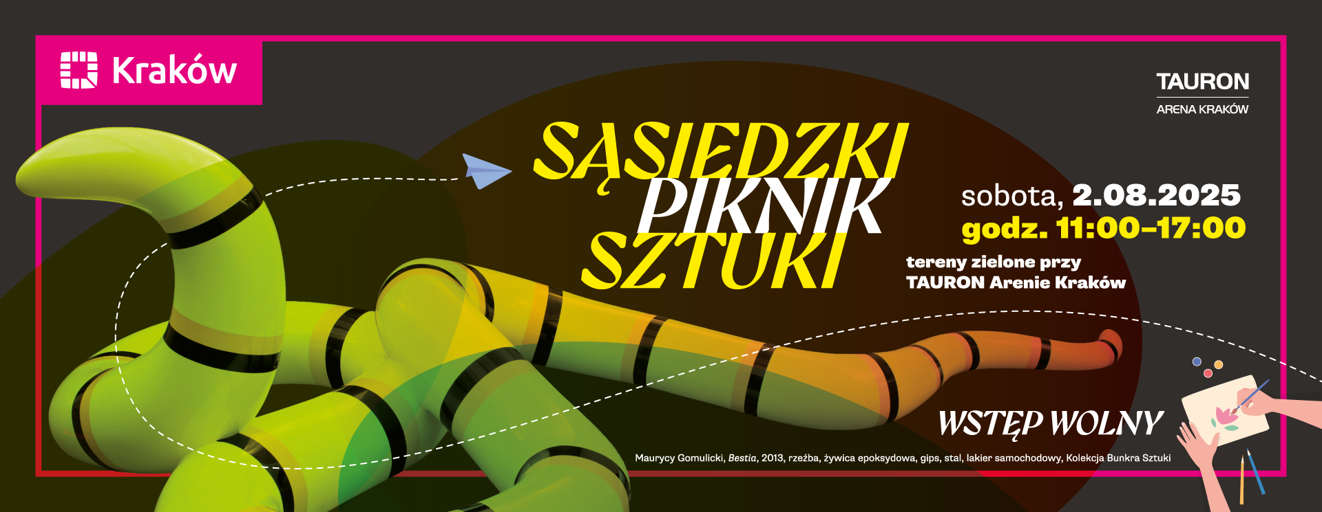 Prezentacja rzeźb z kolekcji Bunkra Sztuki: „Bestii” Maurycego Gomulickiego i „Przekupki” Małgorzaty Markiewicz, wspólne tworzenie obrazu, artystycznych bestii i baśniowych krain, a także masek i bukietów, do tego arteterapia, warsztaty, treningi, gry i zabawy – w sobotę, 2 sierpnia, tereny zielone przy TAURON Arenie Kraków zamienią się w tętniącą życiem i sztuką przestrzeń twórczych spotkań i inspirujących aktywności. Sąsiedzki Piknik Sztuki to międzypokoleniowe, otwarte wydarzenie plenerowe, które łączy sztukę, naturę i lokalną społeczność. Start o godz. 11.00.