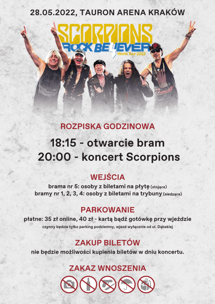 Stoiska, w którym będzie można nabyć gadżety zespołu Scorpions zlokalizowane zostaną przy wejściu nr 1 oraz na płycie hali.
