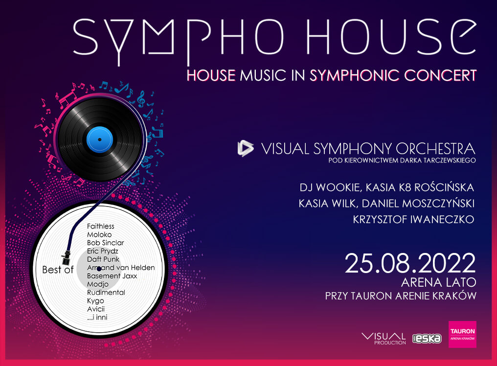 Koncert Sympho House to unikalne połączenie muzyki klubowej i symfonicznych brzmień w wykonaniu Visual Symphony Orchestra, DJ-a i wokalistów. Podczas koncertu usłyszymy najbardziej znane utwory takich artystów jak: Faithless, Moloko, Bob Sinclar, Daft Punk, Eric Prydz, Basement Jaxx, Modjo, Armand van Helden, Kygo, Avicii i inni.
