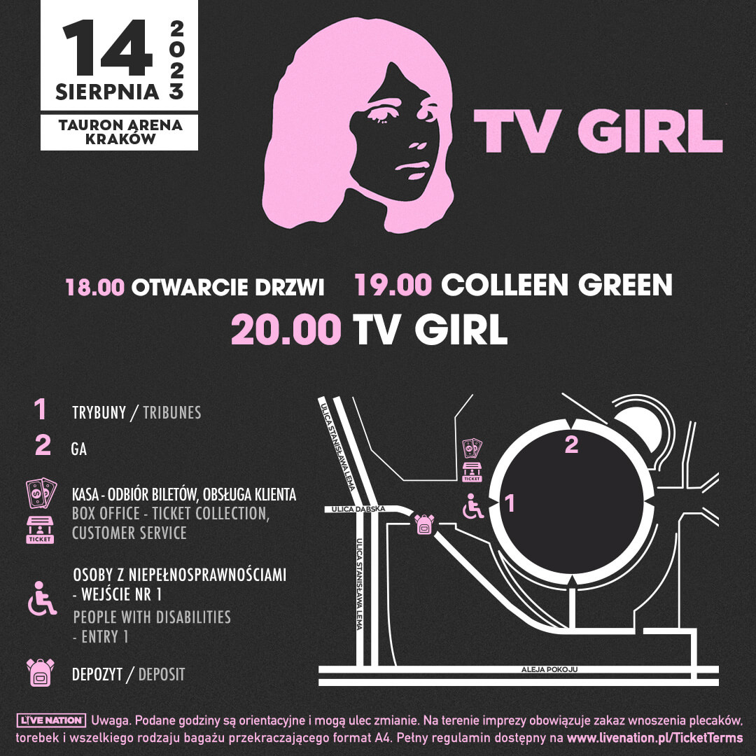TV Girl to z pozoru słoneczna mieszanka francuskiego popu z lat 60-dziesiątych z muzyką soul prosto z południowej Kalifornii. Jednak pod tą lśniącą powłoką kryje się mroczne serce, bijące ostrym dowcipem i cyniczną alienacją, a muzyka jest przez to tym bardziej pociągająca. Zespół 14 sierpnia (poniedziałek) wystąpi w TAURON Arenie Kraków. Jako support przed TV Girl zagra Colleen Green.