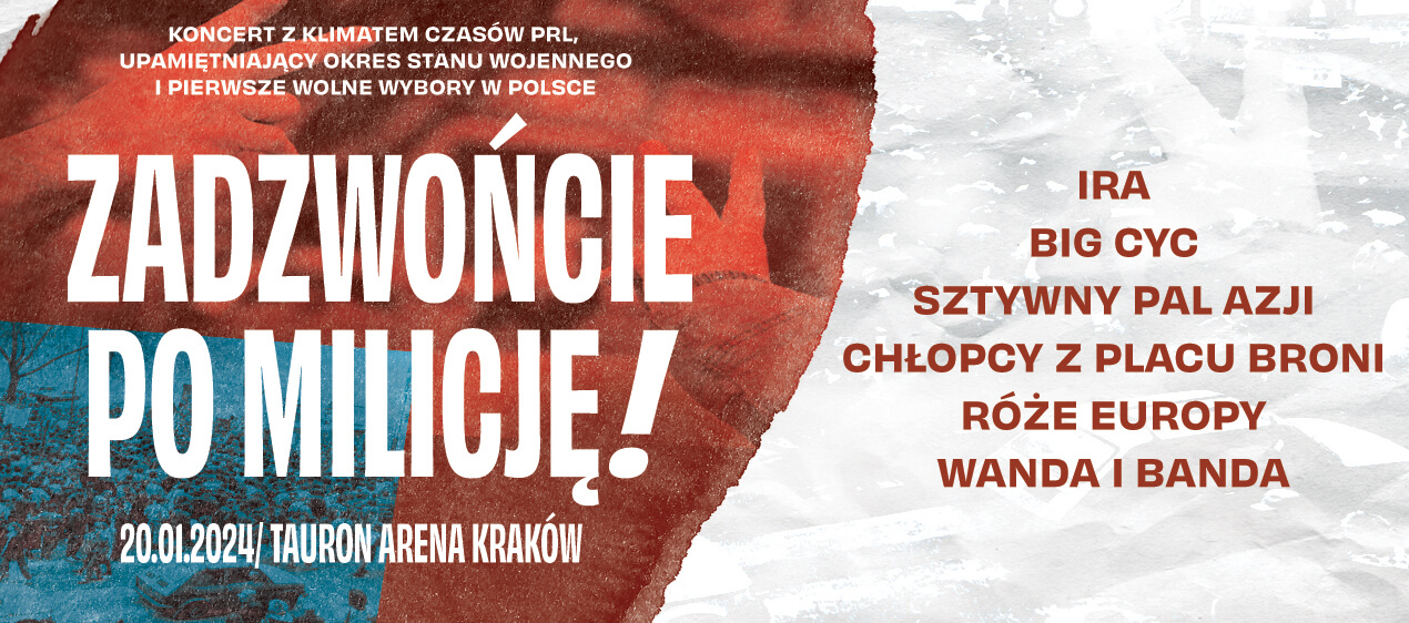 Zadzwońcie po milicję! to koncert największych polskich gwiazd rocka z klimatem PRL-u, upamiętniający okres stanu wojennego i pierwsze wolne wybory w Polsce. Wydarzenie odbędzie się 20 stycznia 2024 r. w TAURON Arenie Kraków.